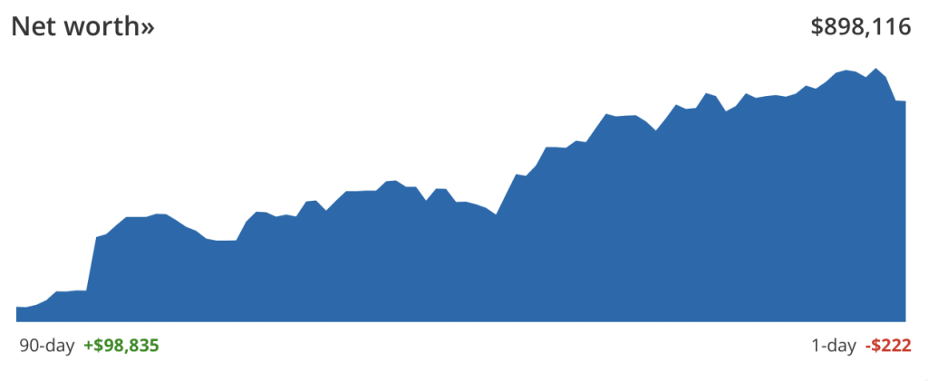 I finally hit $900k in July!! But alas, the market started to go back down, and I am just below the $900K mark now. It was still fun to hit, and it will be fun to hit it a second time. It seems crazy how fast I’m coming up on the liquid million mark. Especially seeing I have not focused on wealth building in over two years.